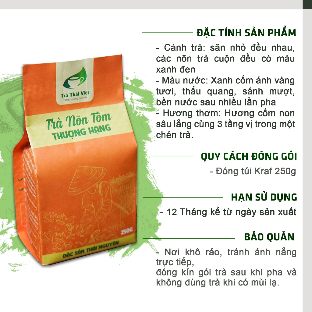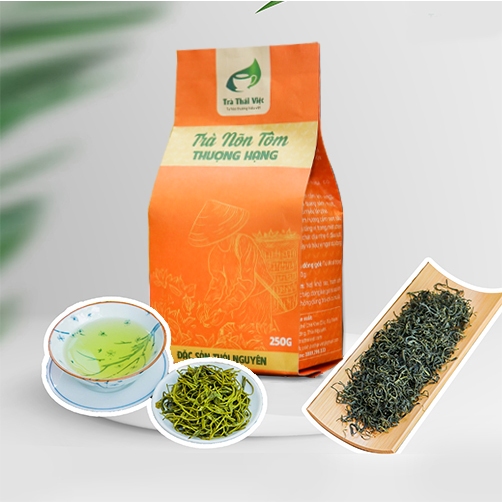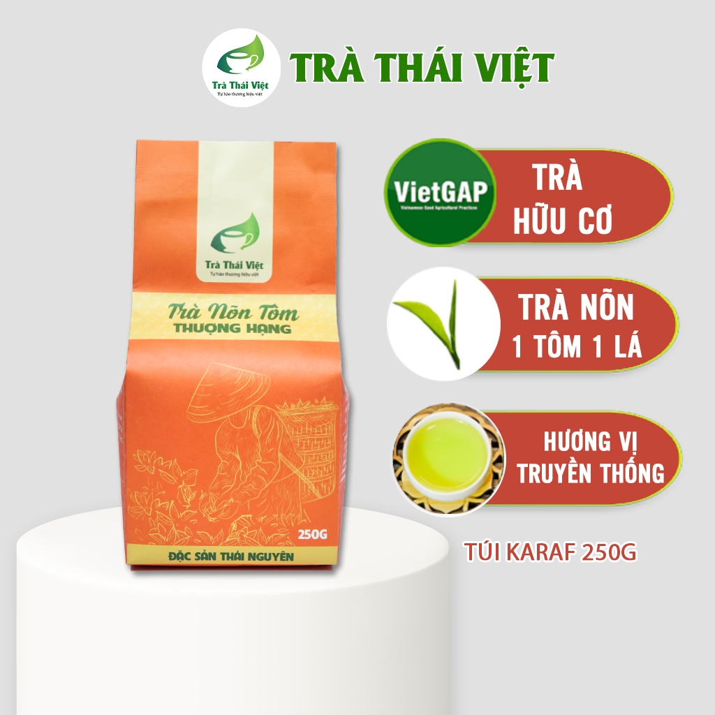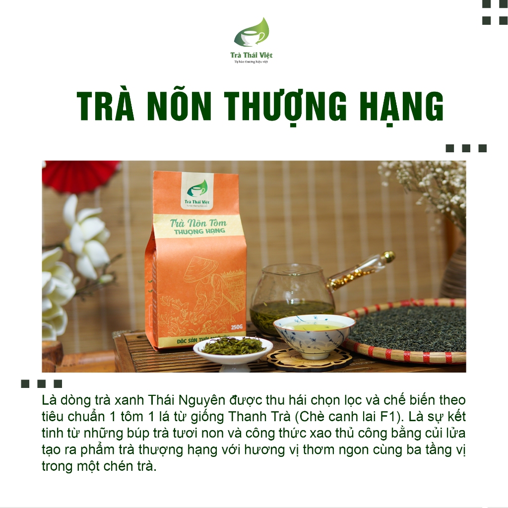 Trà nõn tôm thượng hạng của thương hiệu Thái Việt được thu hái theo tiêu chuẩn 1 tôm 1 chọn lọc lá từ giống Thanh Trà đặc sản (Cành lai F1). Sau khi thu hái chè được chế biến luôn nên vẫn được gọi là dòng trà sao suốt. Sản phẩm là sự kết tinh từ nguồn nguyên liệu quý cùng công thức chế biến thủ công của người Thái Nguyên. Phẩm trà có hương vị thanh tao riêng biệt pha chút ngai ngai của búp chè tươi cùng khí sương của đất trời. Cùng với ba tầng vị trong một chén trà làm say đắm trái tim người yêu trà Việt.
