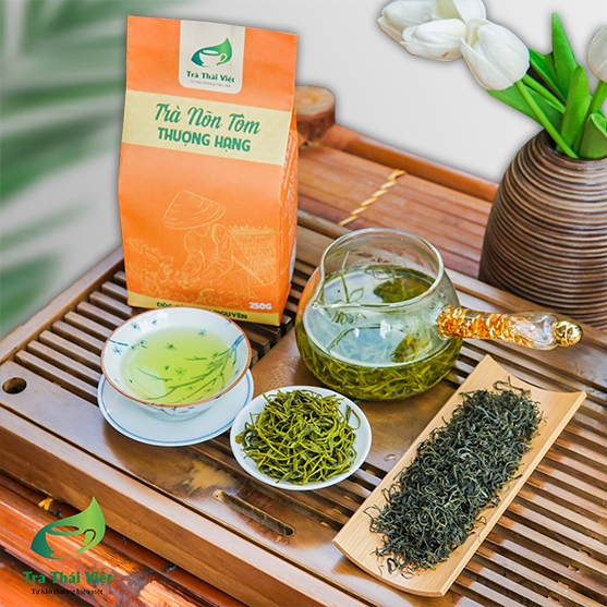 Trà nõn tôm thượng hạng của thương hiệu Thái Việt được thu hái theo tiêu chuẩn 1 tôm 1 chọn lọc lá từ giống Thanh Trà đặc sản (Cành lai F1). Sau khi thu hái chè được chế biến luôn nên vẫn được gọi là dòng trà sao suốt. Sản phẩm là sự kết tinh từ nguồn nguyên liệu quý cùng công thức chế biến thủ công của người Thái Nguyên. Phẩm trà có hương vị thanh tao riêng biệt pha chút ngai ngai của búp chè tươi cùng khí sương của đất trời. Cùng với ba tầng vị trong một chén trà làm say đắm trái tim người yêu trà Việt.