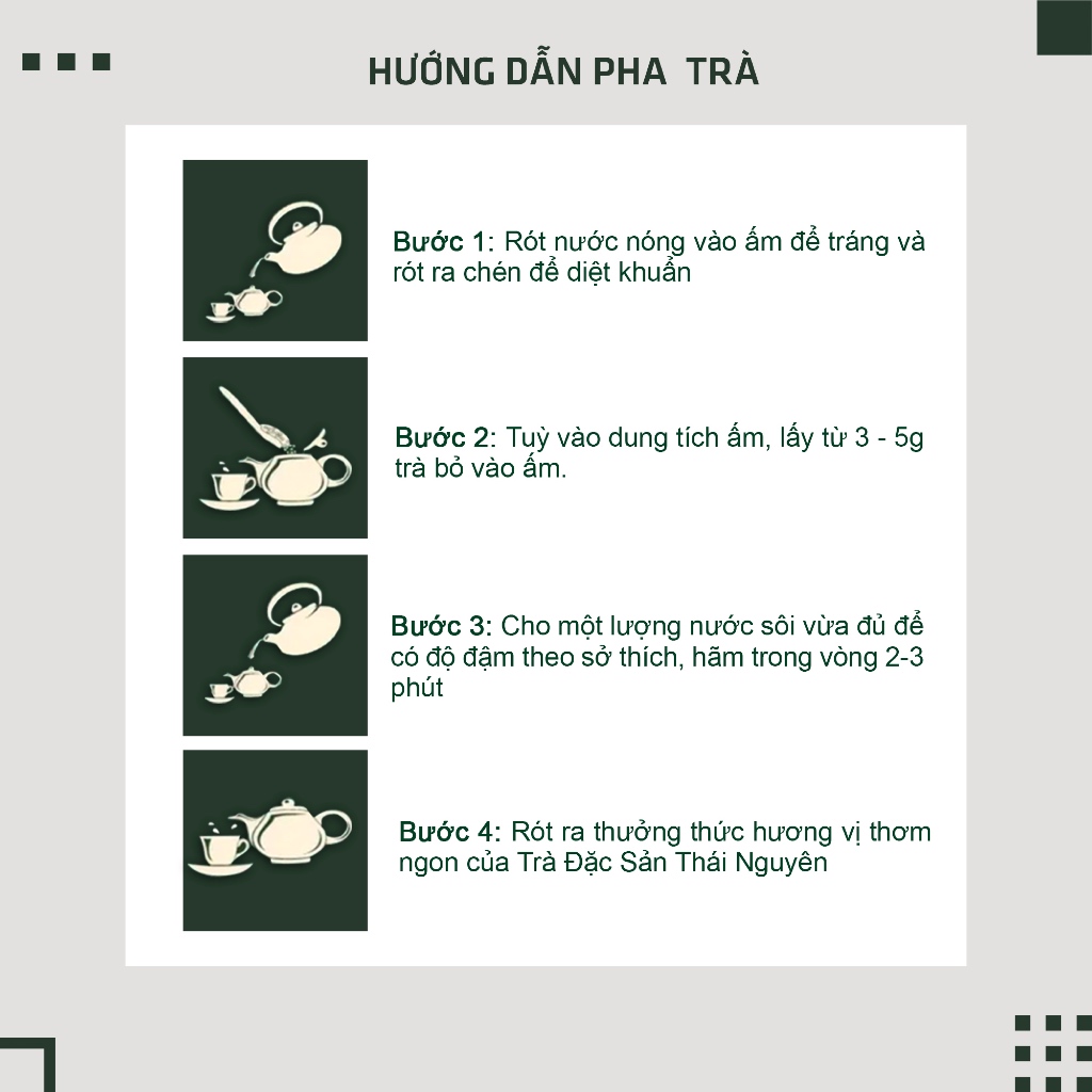 Bảo quản: Nơi khô ráo, tránh ánh nắng trực tiếp, đóng kín gói trà sau khi pha và không dùng trà khi có mùi lạ.