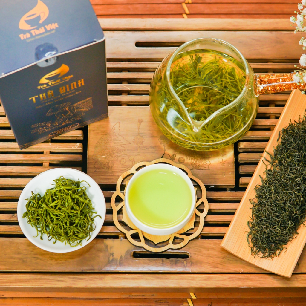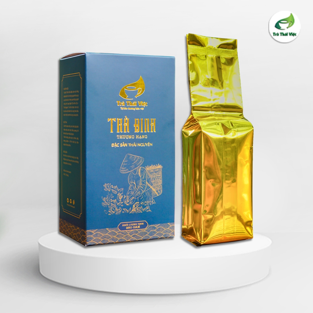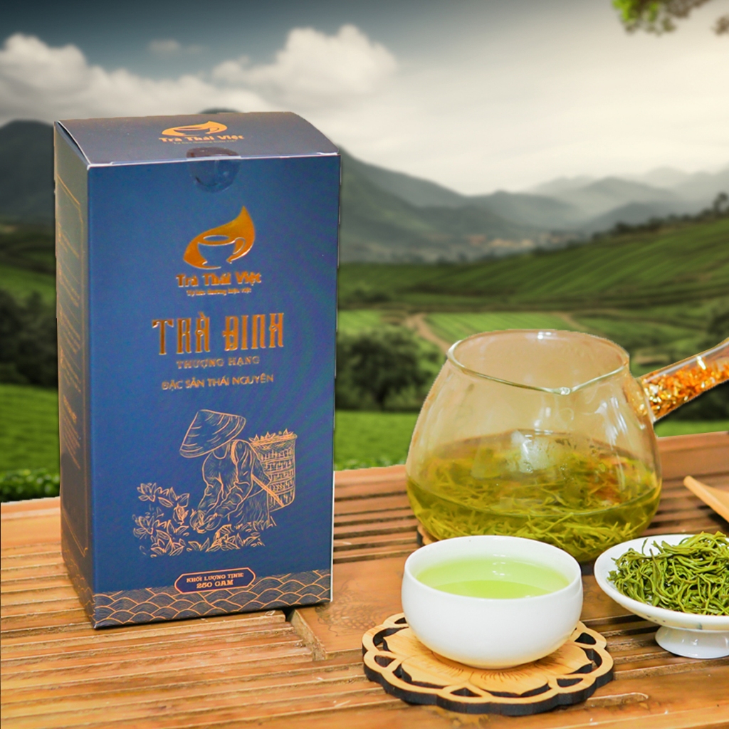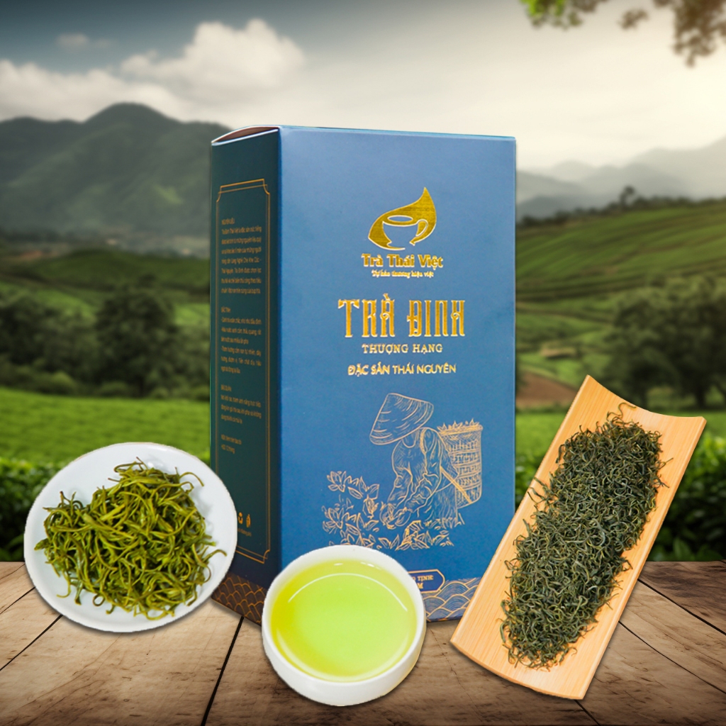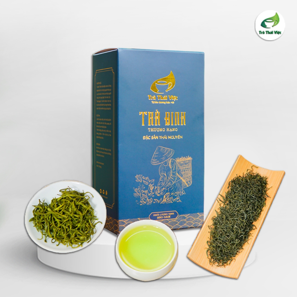 Trà Đinh Thái Việt là đặc sản nức tiếng Thái nguyên được kết tinh từ những nguyên liệu quý và sự khéo léo tỉ mẩn của những người nông dân xứ Trà Thái Nguyên. Phẩm trà được thu hái chọn lọc theo tiêu chuẩn 1 chồi non trên cùng của búp trà thuộc giống Long Vân quý. Sau khi chế biến thành phẩm có hình dáng xoăn, nhỏ li ti như những chiếc đinh nhưng chắc chắn, hương thơm mùi cốm non dễ chịu, chỉ cần sau lượt nước thức trà, cũng đủ để không gian uống trà được bao trùm bởi hương thơm của trà và đặc biệt trà có thể uống nhiều lượt nước mà vẫn đượm hương, đượm vị một cách tự nhiên.