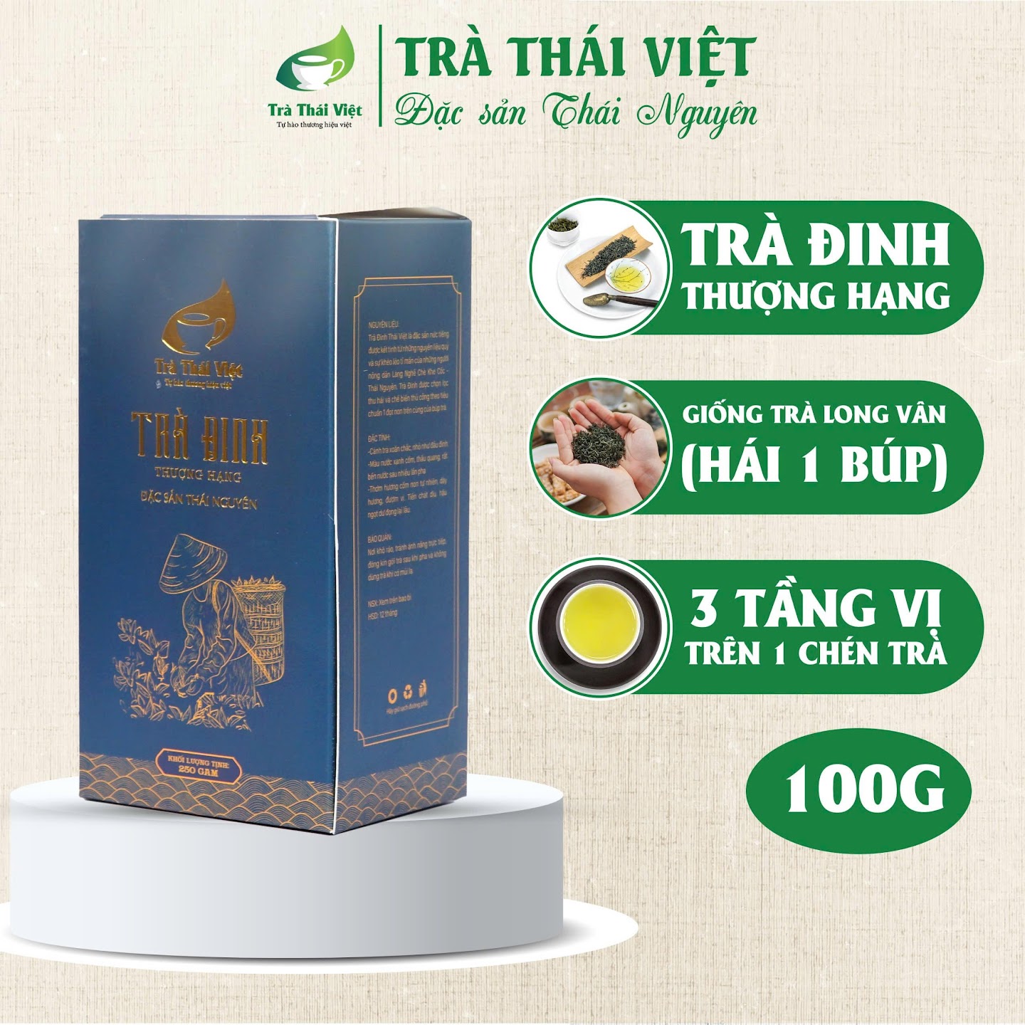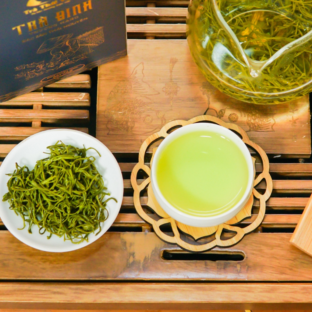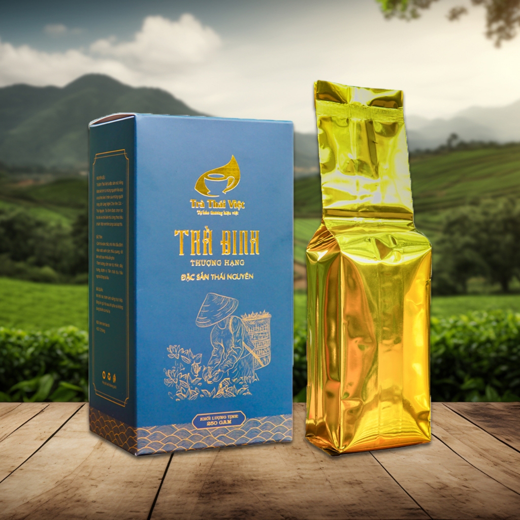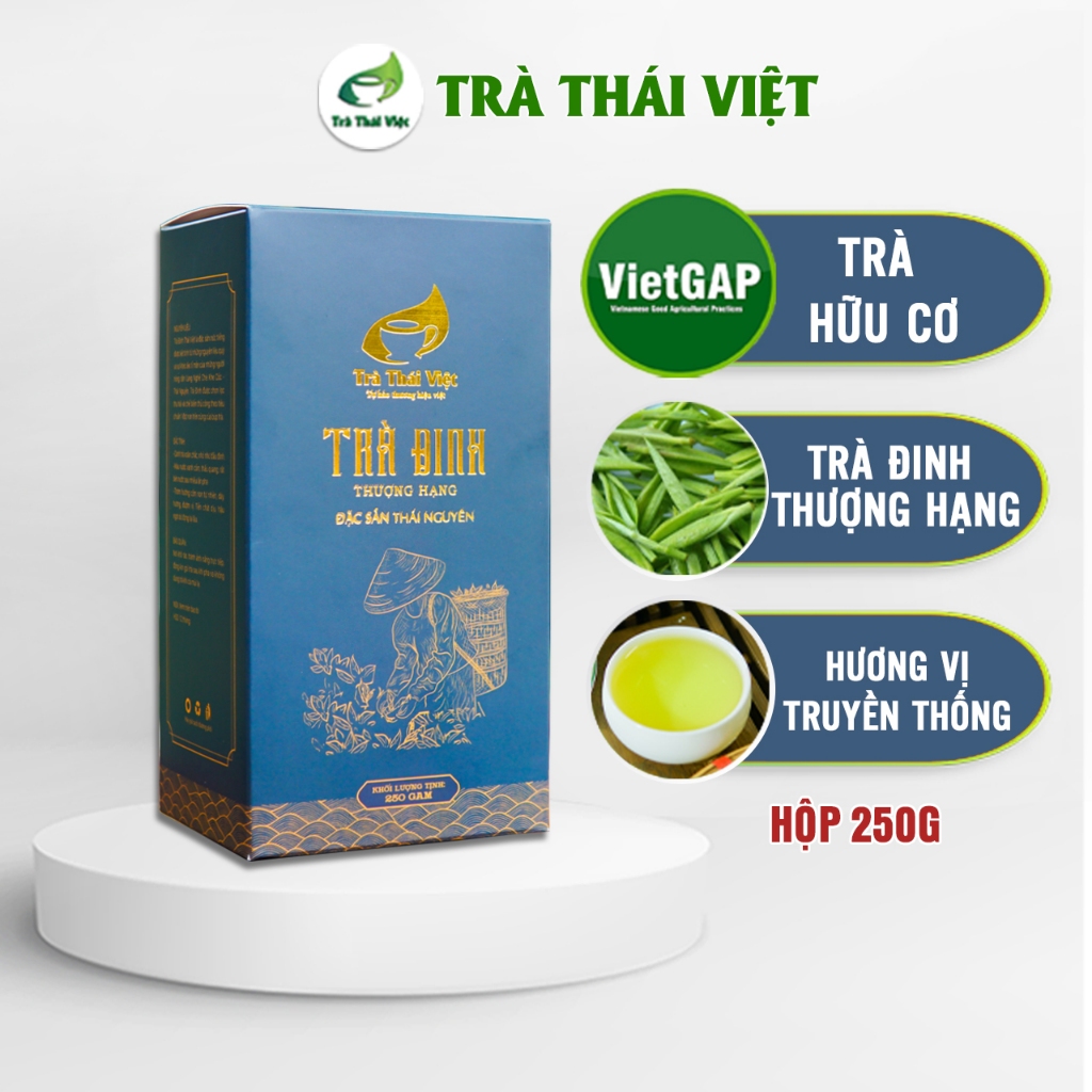 Trà Đinh Thái Việt là đặc sản nức tiếng Thái nguyên được kết tinh từ những nguyên liệu quý và sự khéo léo tỉ mẩn của những người nông dân xứ Trà Thái Nguyên. Phẩm trà được thu hái chọn lọc theo tiêu chuẩn 1 chồi non trên cùng của búp trà thuộc giống Long Vân quý. Sau khi chế biến thành phẩm có hình dáng xoăn, nhỏ li ti như những chiếc đinh nhưng chắc chắn, hương thơm mùi cốm non dễ chịu, chỉ cần sau lượt nước thức trà, cũng đủ để không gian uống trà được bao trùm bởi hương thơm của trà và đặc biệt trà có thể uống nhiều lượt nước mà vẫn đượm hương, đượm vị một cách tự nhiên.